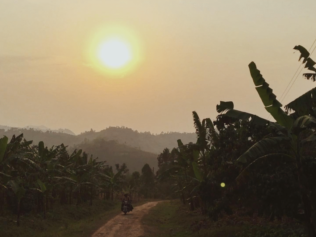 A staple view, common to East Africa, of the Southwestern Ugandan hills showing a road through an abundance of Matooke (highland banana) trees, on a heavy-weight durable yet sturdily comfortable 100% carded cotton t-shirt.