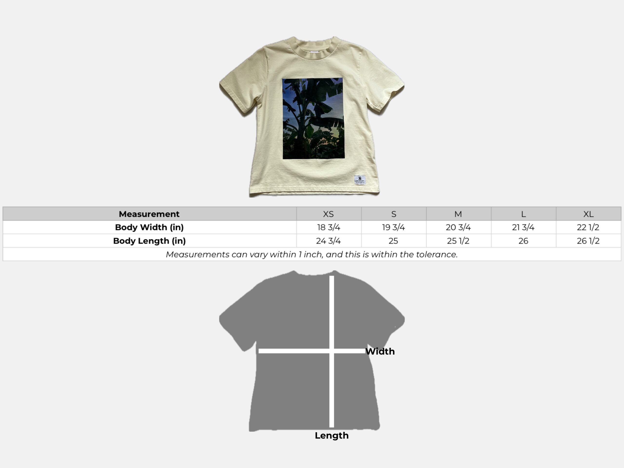 The thick leaves of a Matooke (highland banana) tree create a canopy while a standout bunch in their purple husk attached is soon to bloom out of dormancy, on a heavy-weight durable yet sturdily comfortable 100% carded cotton t-shirt.
